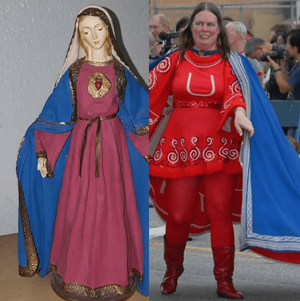 One of my favorite examples of this phenomenon was when I went to an office in the rectory of a church in the Bronx in July 2016 and on a table there was a discarded painted figure of the Blessed Virgin Mary and she was painted in the full colors of Underdog. I assure you this is not a photoshop! I had to snap a picture of it. It would only be noticed or relevant to me in particular and lost on any other parishioners. I had to muse to myself: was the painter an Underdog fan? A Suzanne fan or is this some bizarre christmas miracle (in july?) and only pertinent to me? Judge for yourself!
