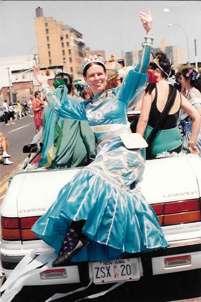“In ’88, when I first began appearing publicly in Ocean City, NJ (that was Supergirl’s year due to Superman’s 50th), I saw that the town had a couple of fictional character mascots, the brainchildren of the town’s own Public Relations Director (!). The PR Director himself took on the role of one of these mascots –“Trash Buster,” an anti-litter crusader. Whereas Trash Buster was not strictly a maritime character, and the other mascot (a mollusk) fit the setting better, there was no mermaid mascot. I wanted to institute a mermaid, but hesitated since I wouldn’t know how to convey myself with my feet encased, as in a sleeping bag, by a costume tail. It wasn’t until either ’89 or ’90 that I found my solution. Inside a fabric store was a photo of a bridal gown, narrow skirted with a big ruffled flounce at the hemline; the wearer’s feet were free for normal walking. Because the bottom ruffle was termed a fish tail, the design seemed custom-made.