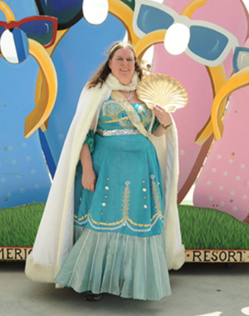 “In ’88, when I first began appearing publicly in Ocean City, NJ (that was Supergirl’s year due to Superman’s 50th), I saw that the town had a couple of fictional character mascots, the brainchildren of the town’s own Public Relations Director (!). The PR Director himself took on the role of one of these mascots –“Trash Buster,” an anti-litter crusader. Whereas Trash Buster was not strictly a maritime character, and the other mascot (a mollusk) fit the setting better, there was no mermaid mascot. I wanted to institute a mermaid, but hesitated since I wouldn’t know how to convey myself with my feet encased, as in a sleeping bag, by a costume tail. It wasn’t until either ’89 or ’90 that I found my solution. Inside a fabric store was a photo of a bridal gown, narrow skirted with a big ruffled flounce at the hemline; the wearer’s feet were free for normal walking. Because the bottom ruffle was termed a fish tail, the design seemed custom-made.