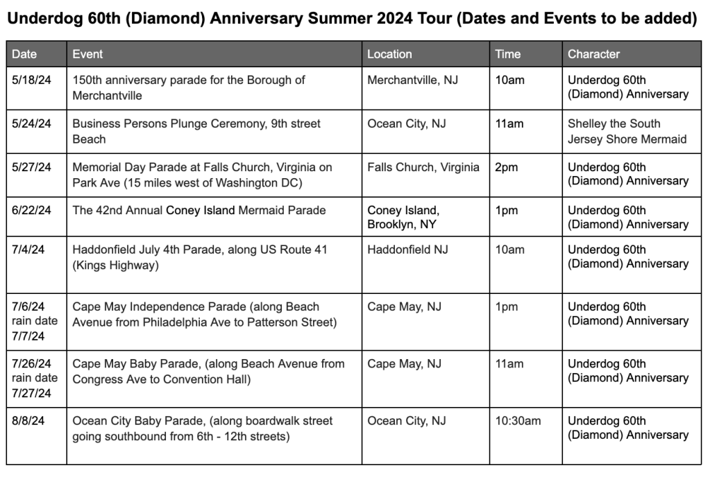 Suzannes Summer itinerary is in full effect as she travels about sharing the good word about Underdogs 60th (Diamond) Anniversary! If you see her at a parade be respectful, kind and take lots of pictures and video and send them to us at: muldowneyville@gmail.com and we will post them and give you credit!