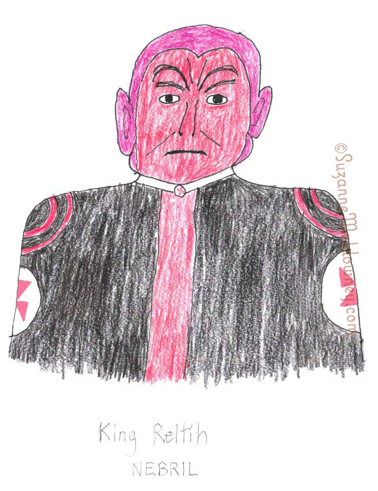 Nebril is the same size as Aslon. Like Ronthaal, Nebril is self-sufficient. But unlike any of the other planets, Nebril refuses to do business with them or to associate with them at all. (The Earthers cannot watch any footage of the surroundings or inhabitants, as none are available.) Its king, Reltih , forbids the natives to migrate, let alone trade, with the others, whereas the natives of all the others work and live in a mixture just like the various Earth peoples. Long ago Nebril had had another name, now forgotten, but at that time the king had mysteriously disappeared. Rumors claimed he had somehow reached another solar system, although deep-space travel did not yet exist for these planets. Upon his return, the king named himself Reltih, the planet Nebril, and barred all contact with the other planets. Only now, in the aftermath of the great rescue, had the other planets succeeded in persuading Nebril to rejoin their family by participating in the Games. In fact, King Reltih had been strangely glad to do so.