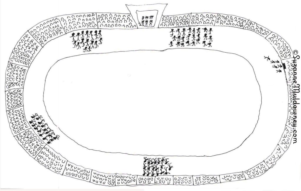 The entire arena sings the Games’ anthem. After the song, King Selon rises and begins an allegorical narration of the planets’ recent threat and rescue. The clustered athletes, still in the six circles, cower as another group of citizens enter en masse from one end of the field. They slowly advance on the athletes, since they represent the outer-space menace. When Selon’s narration comes to the part about Underdog’s coming to the rescue, all eyes turn to the top of a descending ramp, where Underdog stands bearing his flag and beribboned stick. Brandishing these props, he descends until he is at a level with the row of flagpoles. He flourishes his props again, facing the “invasion” of citizens, who then turn around and leave. He hands over his flag which Is then hoisted on the central pole, and then runs down into the arena to the very center, where he officially starts the Games with a ribbon-twirling dance as the clustered athletes and the entire assembly cheer their mascot and rescuer.