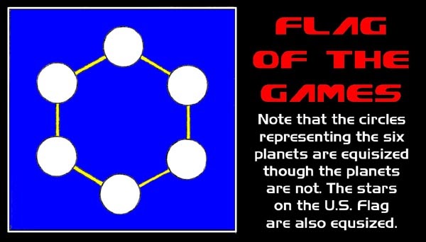 Thus Underdog agrees to participate. When the time comes to leave, he will bring along his friend Polly and several media personnel who can broadcast the Games back to Earth; to go to the Host Planet, compete, and return will take five weeks Earth time. Suddenly Underdog senses bounty hunters on the way and bids Anton to leave immediately. Anton reboards his spacecraft and departs. Two weeks later Polly, several technicians, and Underdog meet in the same spot he had made Anton land before. (The technicians who will tape all the activities have been included in Polly’s strictest confidence, their embarking on a deep-space mission.) A larger spacecraft appears. Anton and Underdog recognize each other. The Earthers board the alien craft and set off for their Olympian adventures. During the voyage, Anton has the Earthers view a filmshow containing information on the planets which are to participate in the upcoming Games.
