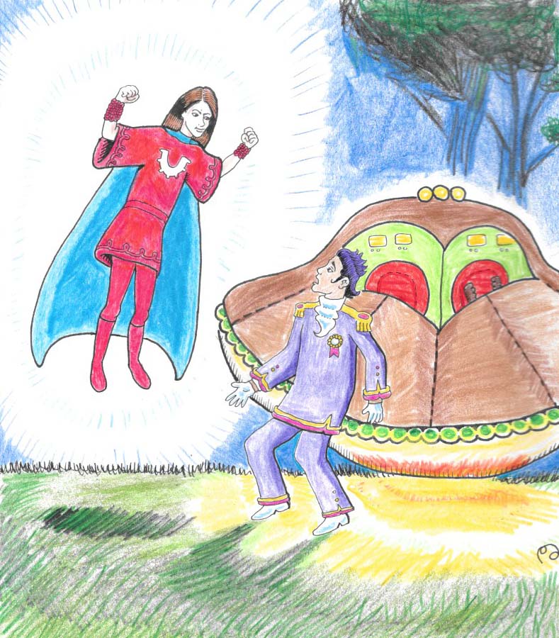 For the rest of the voyage, the Earthers review the documentary on the planets and also information on the various Games. Underdog especially educates himself on the basics of the Games in which he chooses to participate. Upon reaching the outskirts of the solar system, the spacecraft orbits its perimeter, so that the planets realize their distant mascot is arriving. Then the spacecraft heads for the port at Aslon City, where the Games are to be held. Vast crowds watch the spacecraft land. Several Aslonian dignitaries greet Anton, Polly, and the group of Earth camerapeople. Everyone pauses as down an aisle come King Selon and Queen Jolan. They stop a few feet from the spacecraft door. Then out steps Underdog. The crowds cheer and wave ribbons on sticks, their method of saluting a VIP. The Aslonian royal pair present Underdog with a many-stranded ribbon and an official Games flag, both of which he is to wave at the opening ceremonies. All the Earthers are escorted by the royal retinue to a bungalow reserved as living quarters for the Earthers. A day or two goes by before the official start of the Games. While Polly and the media technicians set up their gear, Underdog practices for his events. As advised by Anton, Underdog does his best not to go too far, to control his powers. But he soon discovers that his powers have lessened without his help. He loses his energy faster and must revitalize more frequently with his energy pills.